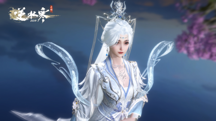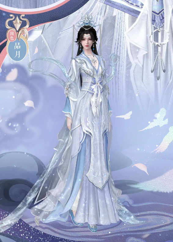 女款时装【海镜霜繁】以银白为主色调,辅以海蓝作为点缀,还原了动画中李慕婉那飘逸灵动的造型。空灵优雅的时装正好契合女主的人设,温润清透任谁见了都会为之心动。